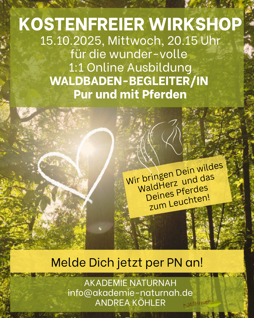 in Deutschland: Online-Live oder Vor-Ort-Live-Ausbildung zum/r Waldbaden-Begleiter/in NATURNAH mit PFERDEN und PURoder Waldbaden-Begleiter/in Pur, jeweils inkl. Zertifikat